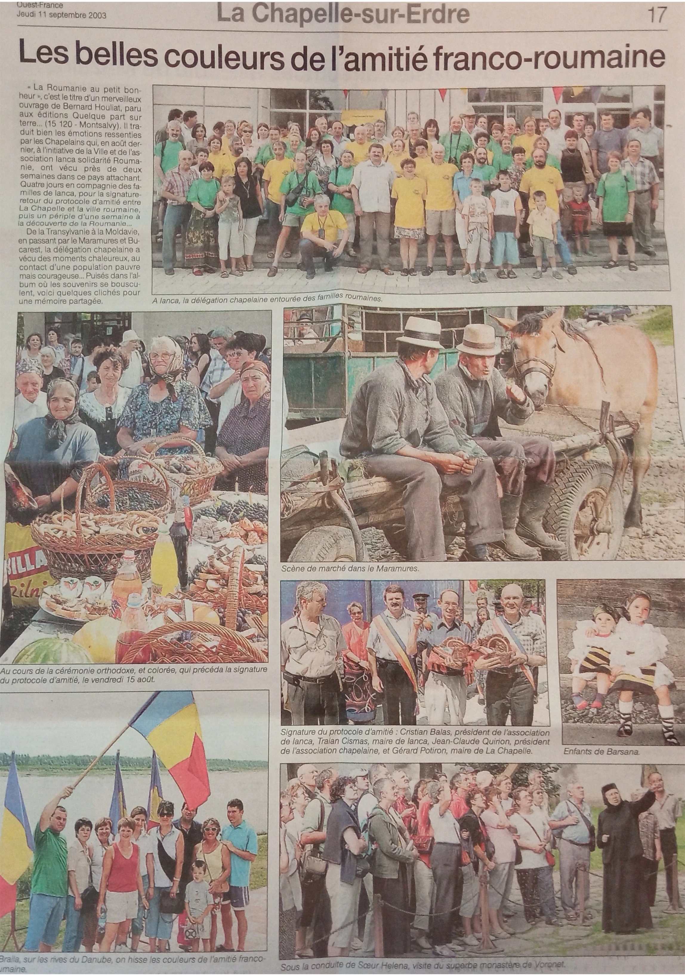 C'est en août 2003 que tout commence, une délégation chapelaine se rend en Roumanie afin de signer un protocole de l'amitié entre les communes de Ianca et de la Chapelle sur erdre. Les signataires sont, de gauche à droite sur la photo, monsieur Christian Balas (président de l'association à Ianca), monsieur Traïan Cismas (Maire de Ianca), monsieur Jean Claude Quirion (président de l'association à la Chapelle sur Erdre) et monsieur Gérard Potiron (maire de La Chapelle sur Erdre). Voici un lien vers un article de presse de Ouest France sur cette rencontre.